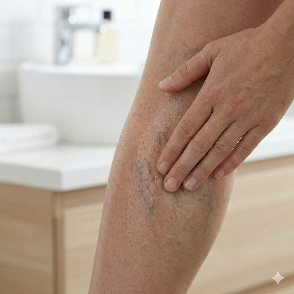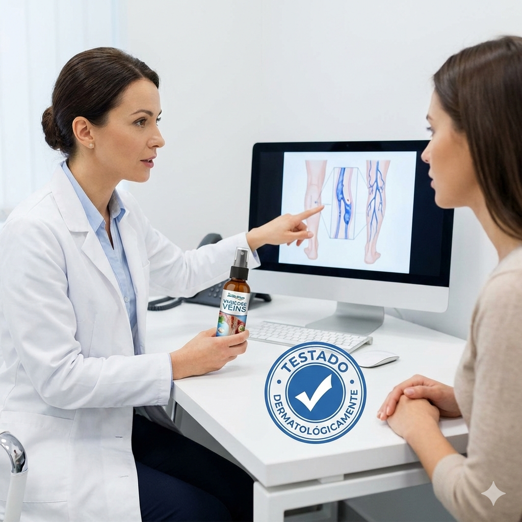 Las moléculas de las cremas antiguas son demasiado grandes y se quedan atrapadas en la superficie (por eso manchan y no funcionan). Nuestra fórmula utiliza partículas 100 veces más pequeñas diseñadas para cruzar la piel y llegar hasta las válvulas venosas, reparando el problema desde dentro, no desde fuera